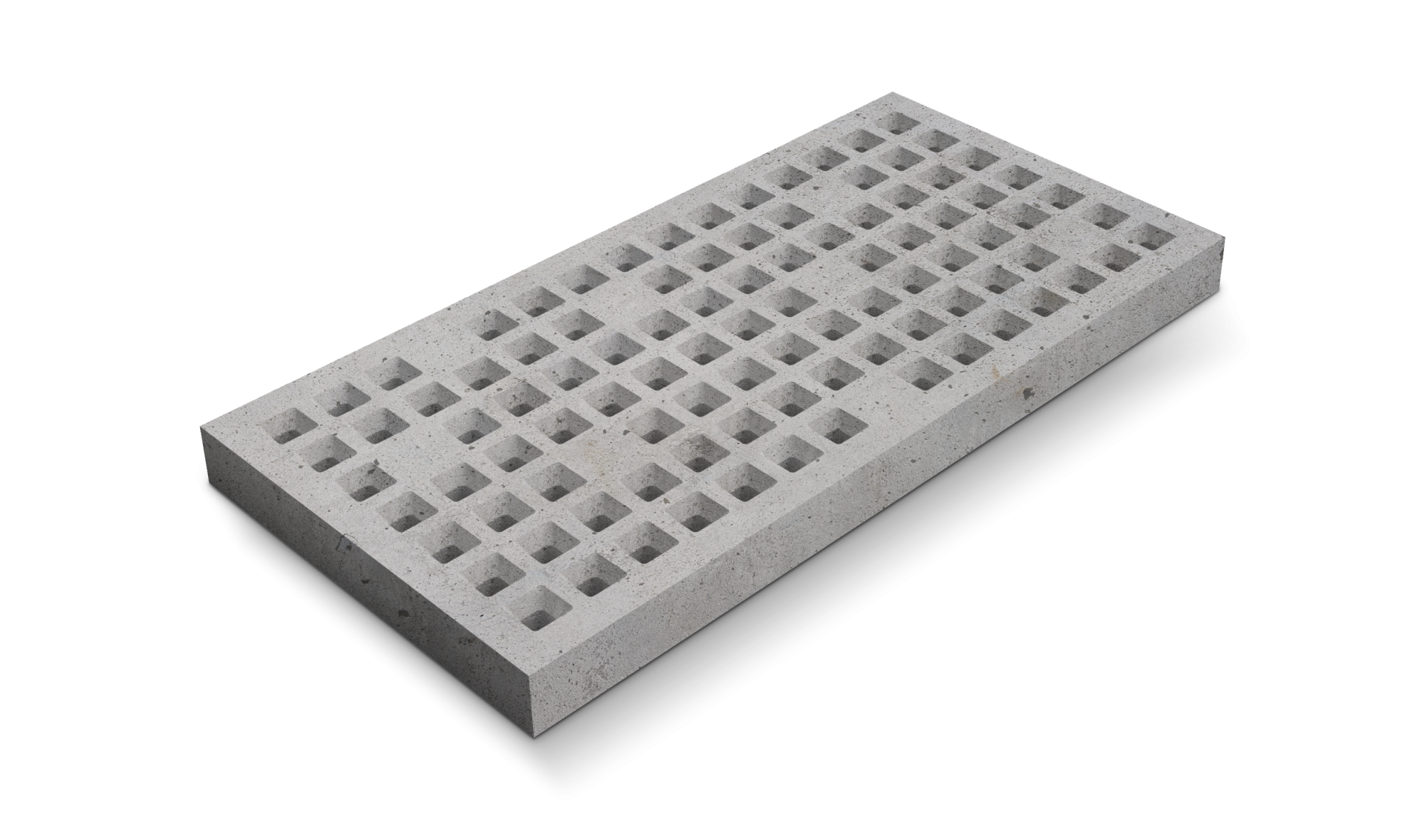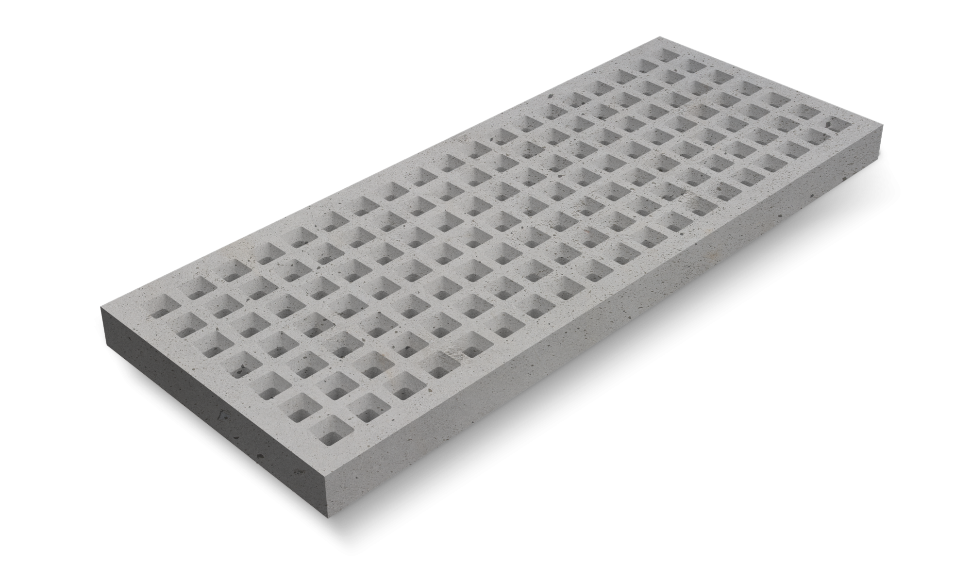 Klassieke grasdallen hebben door hun kleine formaat het nadeel dat ze verschuiven en door hun grote puntlasten putten maken in de fundering. De Industrial tegels van Deer worden gemaakt voor een breed scala aan projecten die specifiek bestand moeten zijn tegen zwaar verkeer. Hiertoe voorzien we twee formaten. De Small Industrial tegels meten 2 m op 1 m, terwijl de Large Industrial tegels 2,5 m op 1 m zijn. Beide hebben een dikte van 14 cm én ze zijn dubbel gewapend, wat zorgt voor de extra kracht die nodig is in industriële toepassingen. Door de combinatie van formaat en wapening worden de lasten beter verdeeld over de fundering en verschuiven ze minder snel. De plaatsingsvoorschriften zijn afhankelijk van de belasting; de permeabiliteit en grasopening variëren per type.